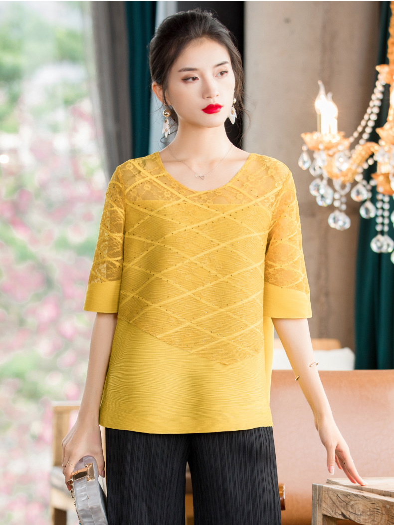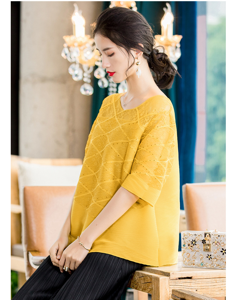 You are here: Home / Product / High Qulity Pleats / Women Embroidered Nail Beads Large Pleated Tops 2020 New Spring Round Neck T-shirt